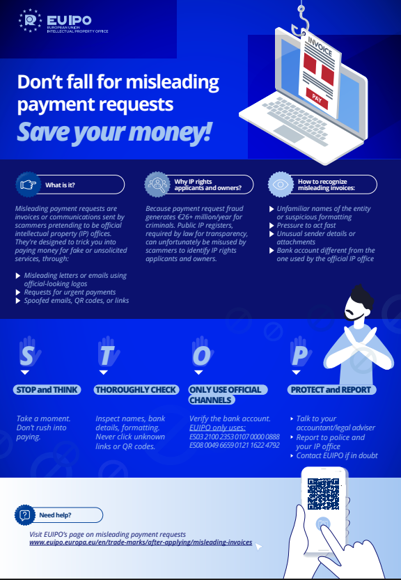 EUIPO 등 공식 기관을 사칭하며 로고, QR코드, 긴급 문구 등을 이용해